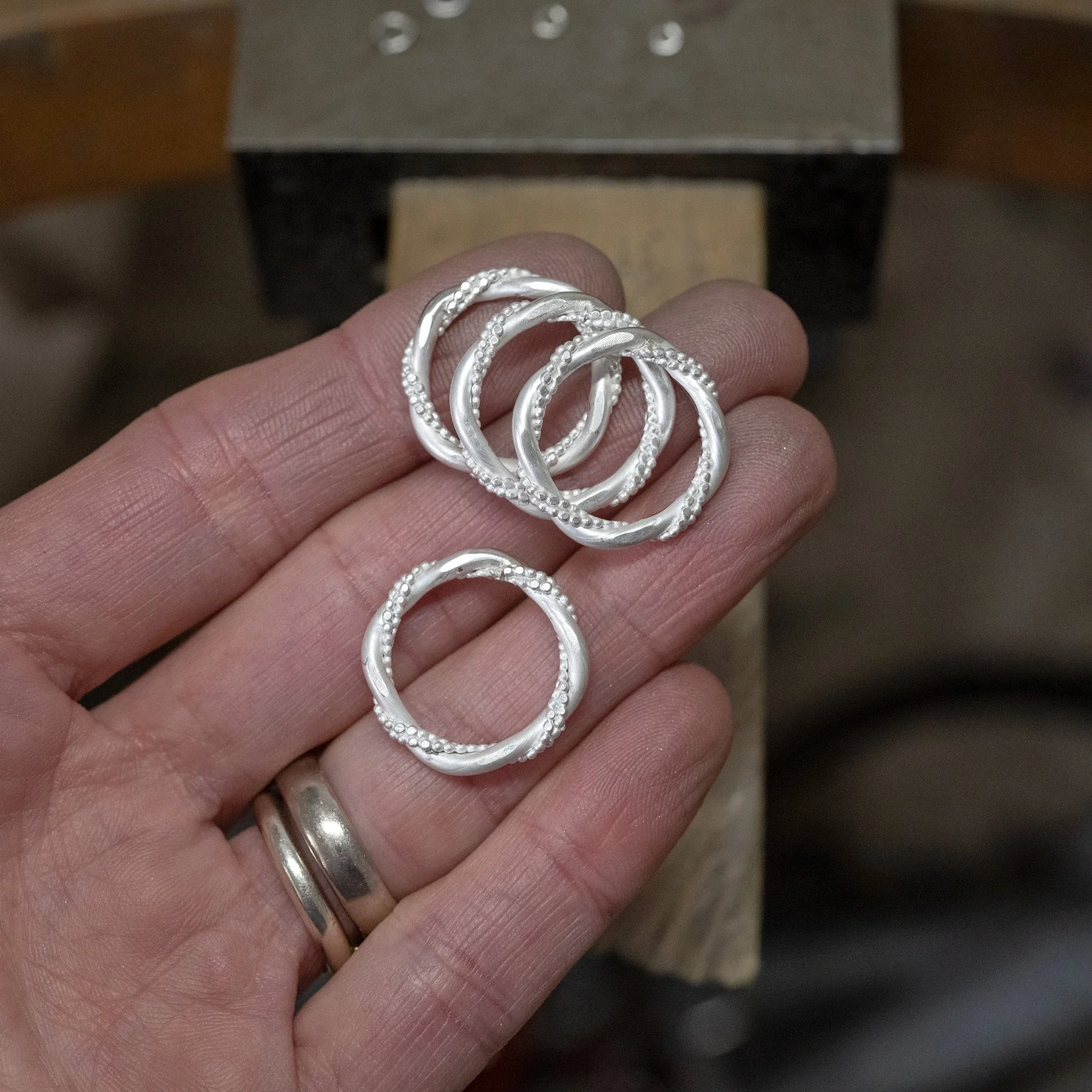When the twist goes smoothly, I can usually make about five rings from one length of wire, however because of those delicate wires, things don’t always go according to plan. Sometimes the twist shifts out of alignment, or worse, one of the wires breaks under the drill’s pressure. When that happens, I may only get three or four rings from the same length of silver. At this point, we can only twist the wire to a certain point, so some twists may be tighter than others and the ring sizes may slightly differ. Any cut off’s where the twist has gone wrong, I try to repurpose into earrings so there’s little wastage.