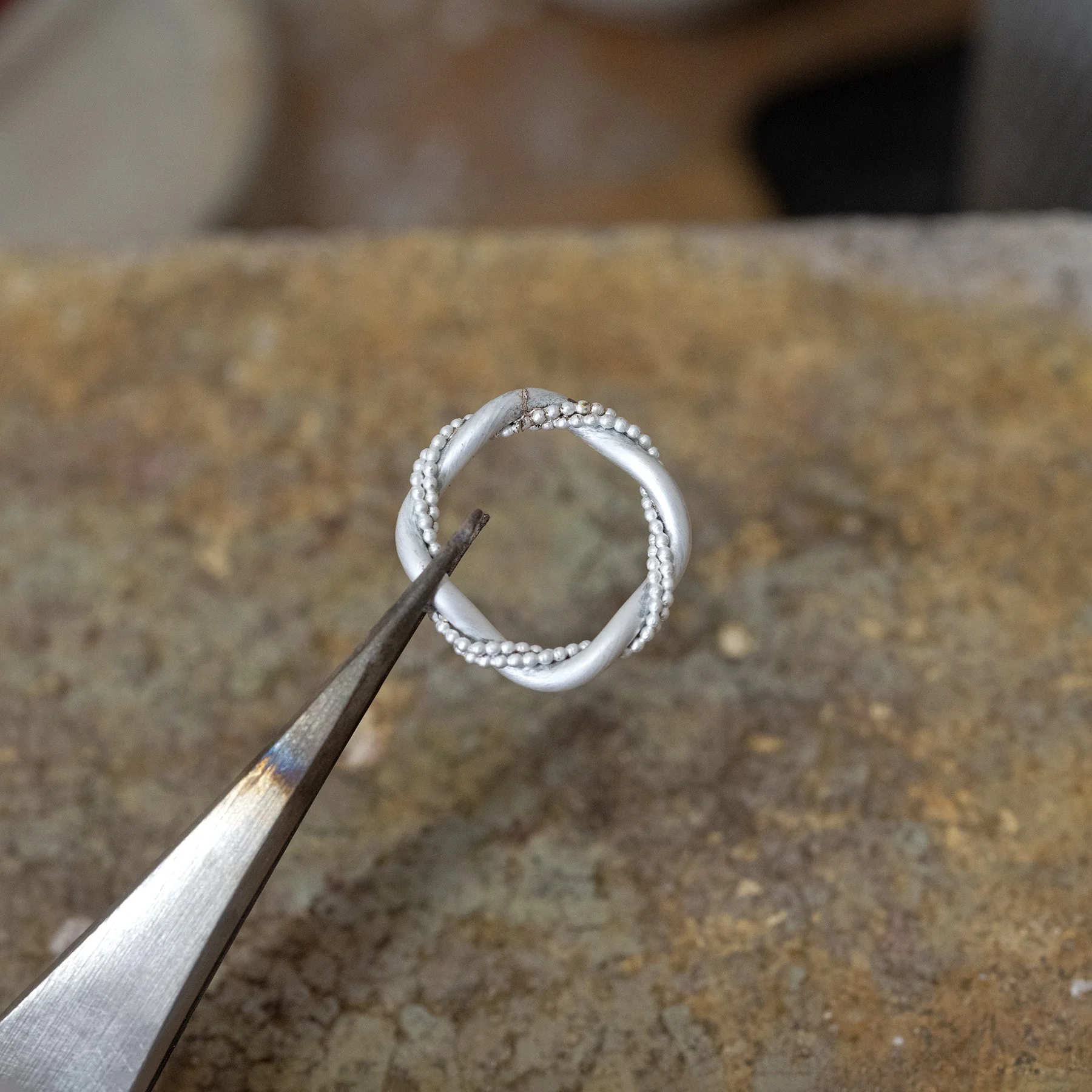 Once the twist is complete, it’s on to the next phase, lots of soldering! I reinforce sections of the twisted wire to make sure the finer wires stay securely in place. This is crucial for the next stage, the forming process. I wrap the twisted wire around a form to start shaping the rings and making sure every overlap aligns perfectly. This is to ensure that each ring will have a fluid twist and a hidden join.