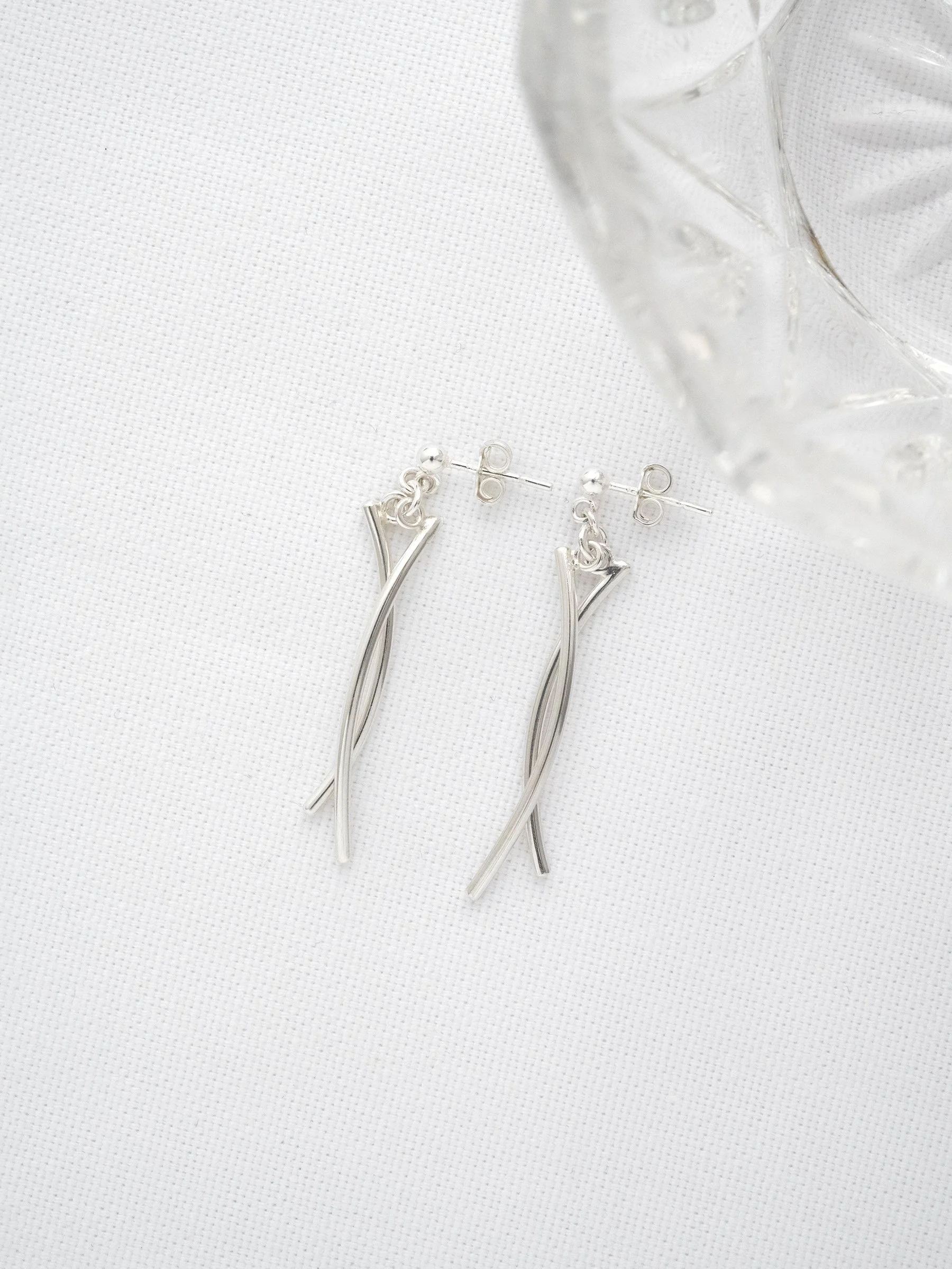 These elegant crossover drop earrings have been lovingly handcrafted in my home studio along the south coast. Made from recycled sterling silver, they’re lightweight and super tactile, featuring two silver curved elements, overlapping each other and move freely.